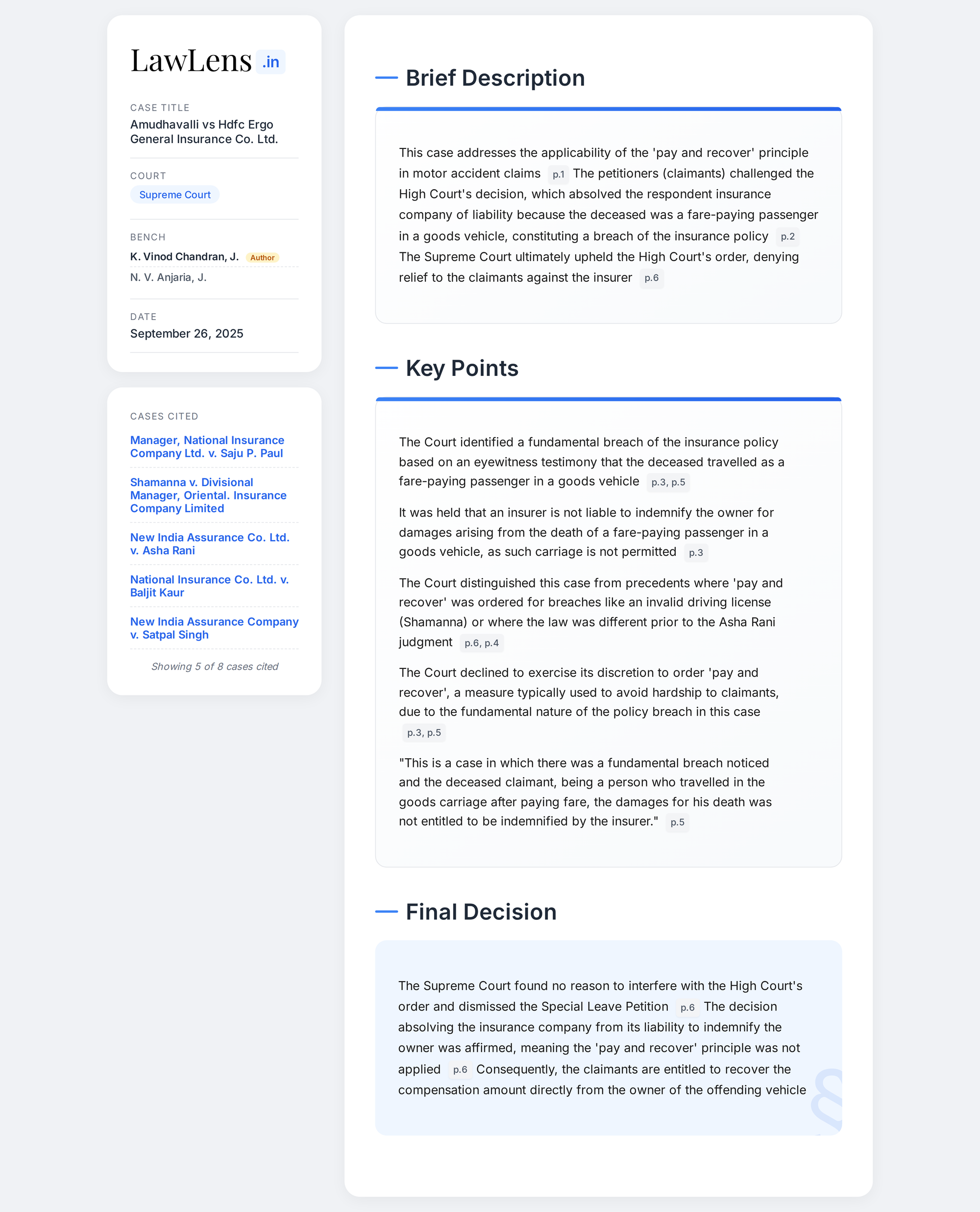 Amudhavalli vs HDFC Ergo General Insurance Co. Ltd. 2025 INSC 1219 -Motor Accident Compensation - Pay and Recover - Fundamental Breach