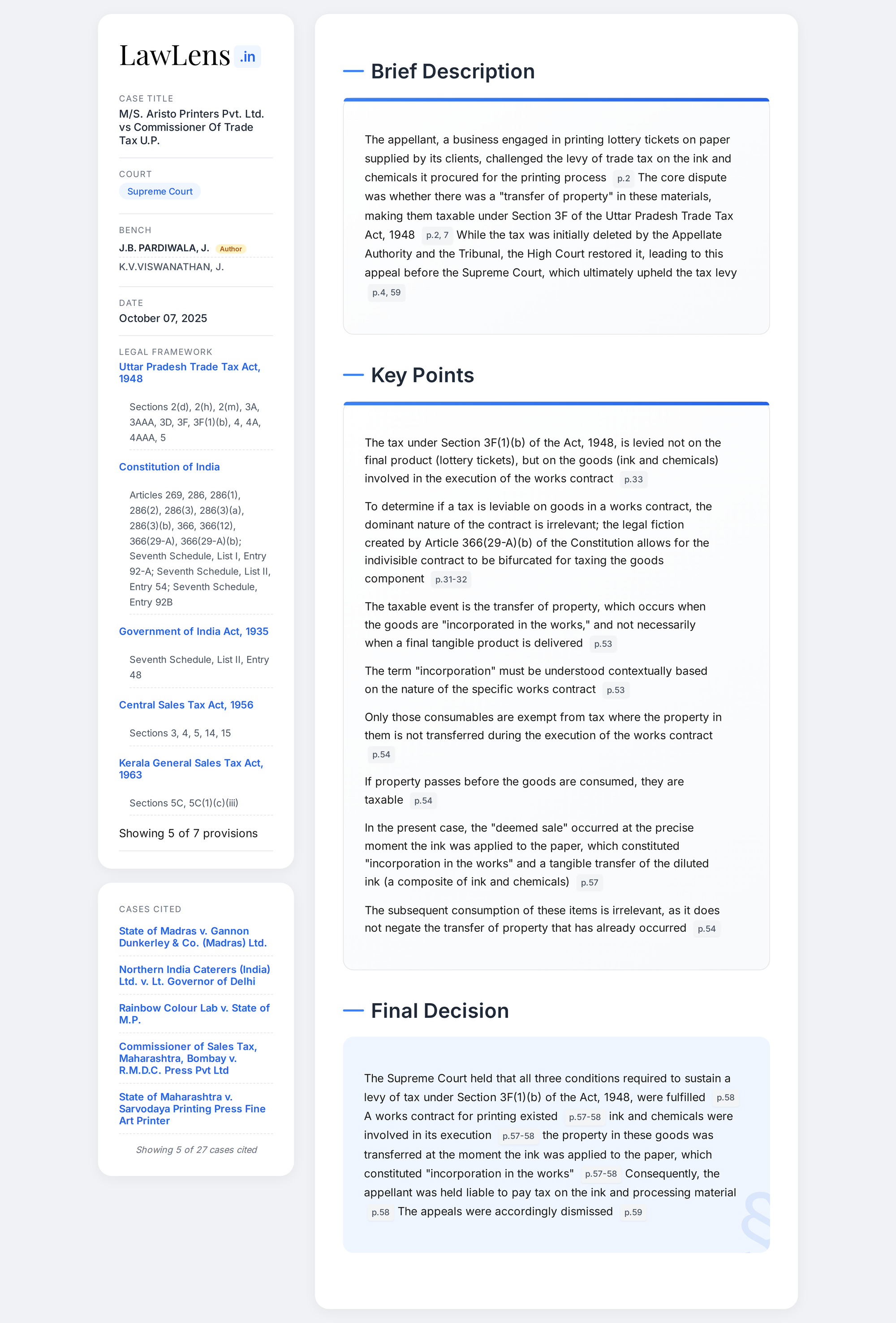 - Case name: M/S. Aristo Printers Pvt. Ltd. v. Commissioner of Trade Tax, Lucknow, U.P.