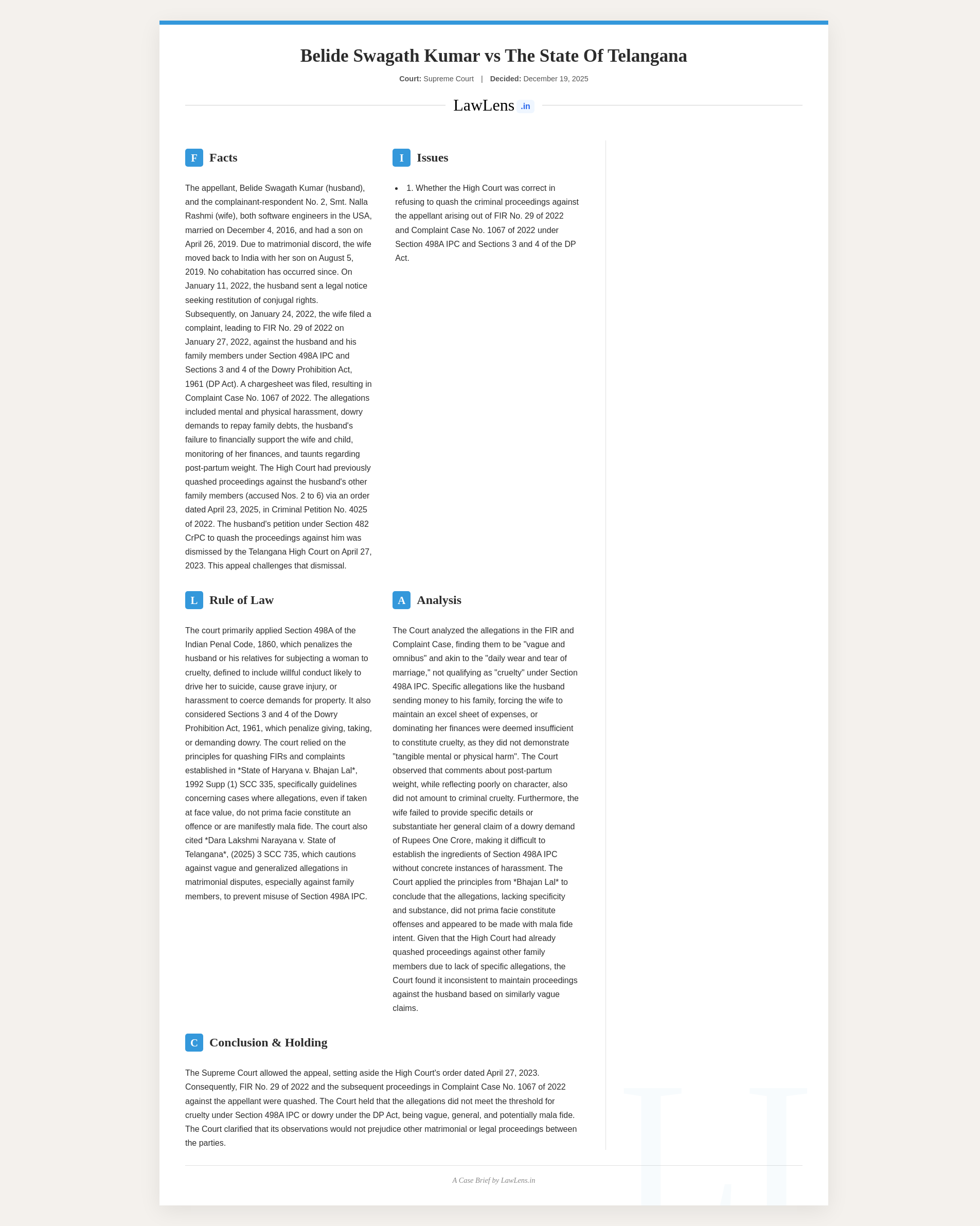 Belide Swagath Kumar v. State of Telangana & Anr., 2025 INSC 1471 - S.498A IPC - Financial Dominance Of Husband - Lack Of Care