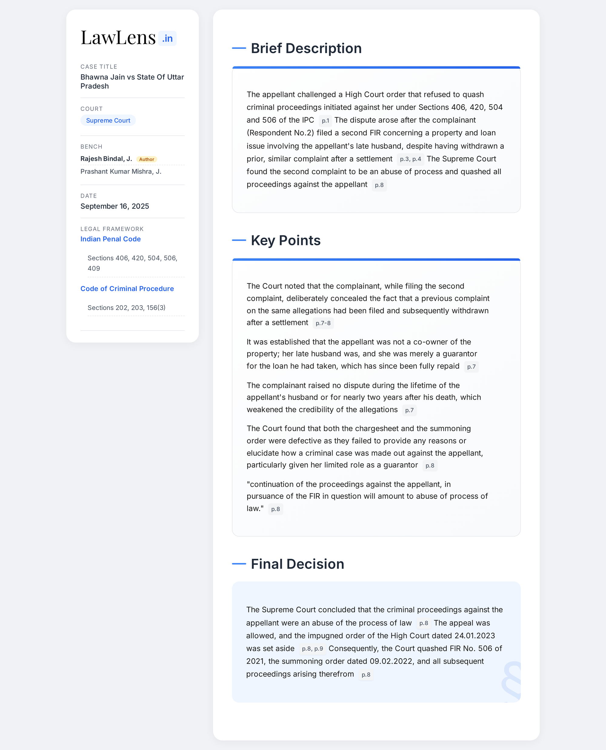 Code of Criminal Procedure 1973 – Section 482 [Section 528 BNSS] - While allowing appeal and quashing criminal proceedings, SC observed:The second complaint was filed without disclosing the factum of the filing and withdrawal of the first complaint concerning the same dispute Even in the chargesheet filed in pursuance of the FIR in question, there is no mention of the filing and withdrawal of the first complaint for the same dispute. The chargesheet did not elucidate as to how the case was made out against the appellant -Even in the cognizance and summoning order passed by the Court below, no reasons have been assigned as to how a case is made out against the appellant, who was merely a guarantor to the loan, which, after the death of the husband of the appellant, stands settled. From the facts as notices above no case for summoning the appellant in the complaint was made out- the present appeal deserves to be allowed as continuation of the proceedings against the appellant, in pursuance of the FIR in question will amount to abuse of process of law. (Para 9-10)