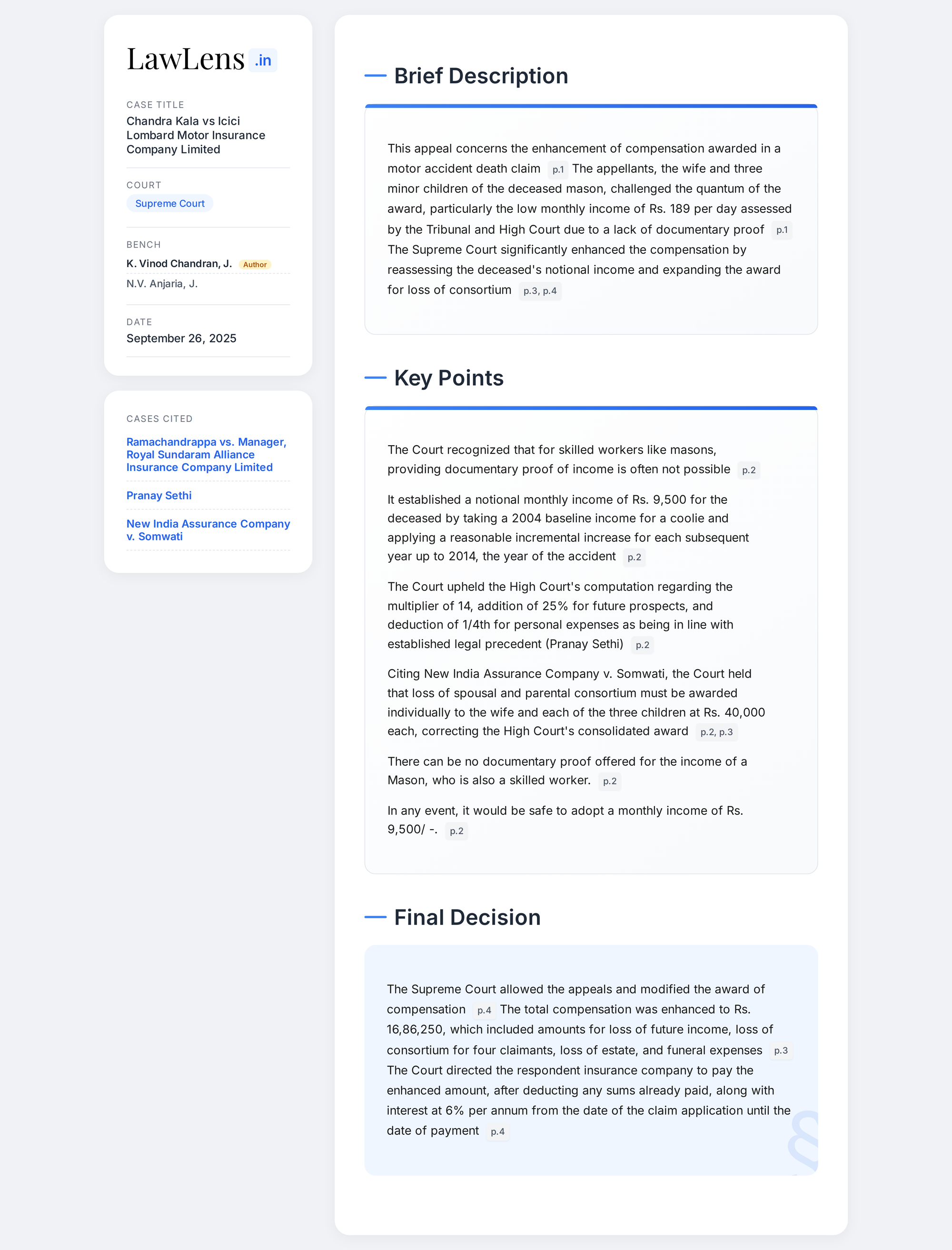 Chandra Kala vs ICICI Lombard Motor Insurance Company Limited 2025 INSC 1220 - Motor Accident Compensation - Mason