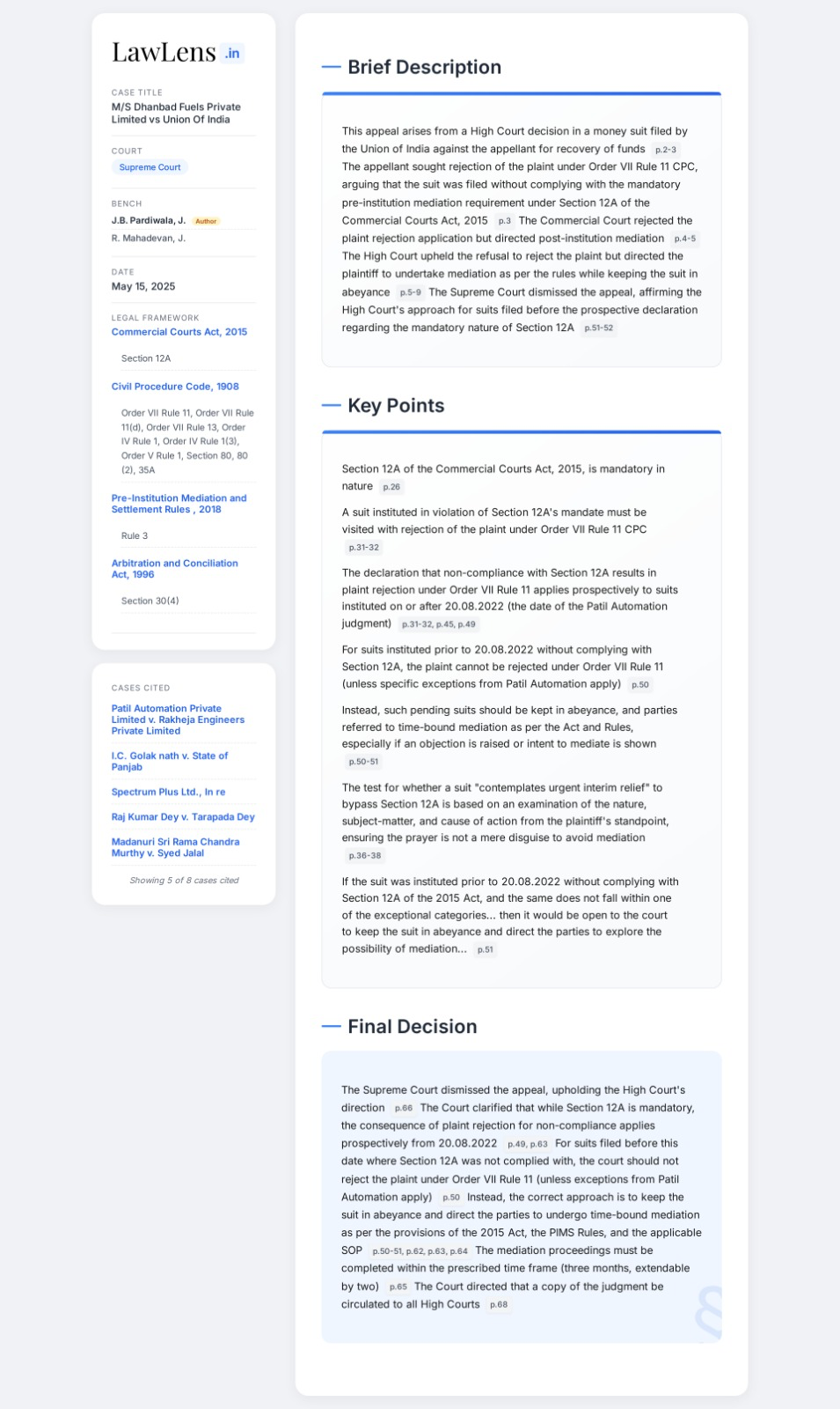 Dhanbad Fuels Private Limited vs Union Of India 2025 INSC 696 - S. 12A Commercial Courts Act - Pre Litigation Mediation - Order VII Rule 11 CPC