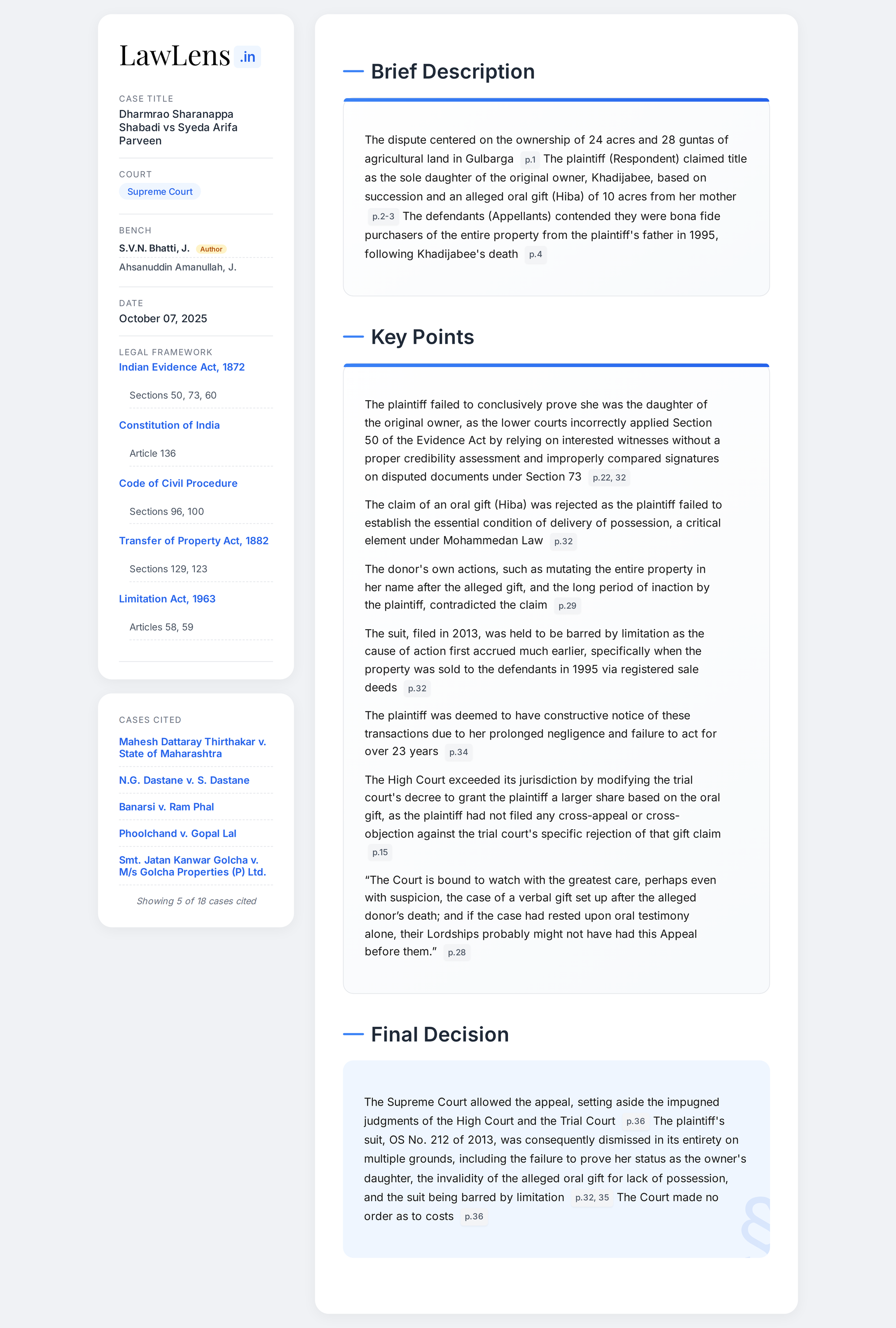 Dharmrao Sharanappa Shabadi vs Syeda Arifa Parveen - 2025 INSC 1187 Muslim Law- Oral Gift -Ss. 50,60, 73 Evidence Act