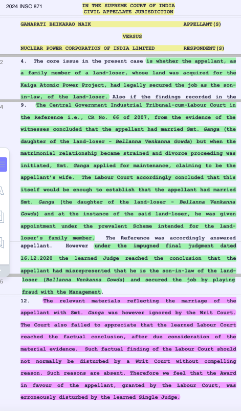 Summary: The appellant, as a family member of a land-loser, whose land was acquired for the Kaiga Atomic Power Project, had secured the job as the son-in-law, of the land-loser - Central Government Industrial Tribunal-cum-Labour Court in the Reference from the evidence of the witnesses concluded that the appellant had married the daughter of the land-loser - High Court set aside the Labour Court order holding that the appellant had misrepresented that he is the son-in-law of the land-loser - Allowing appeal, SC observed: Relevant materials reflecting the marriage was ignored by the Writ Court. The Court also failed to appreciate that the Labour Court reached the factual conclusion, after due consideration of the material evidence. Such factual finding of the Labour Court should not normally be disturbed by a Writ Court without compelling reason.