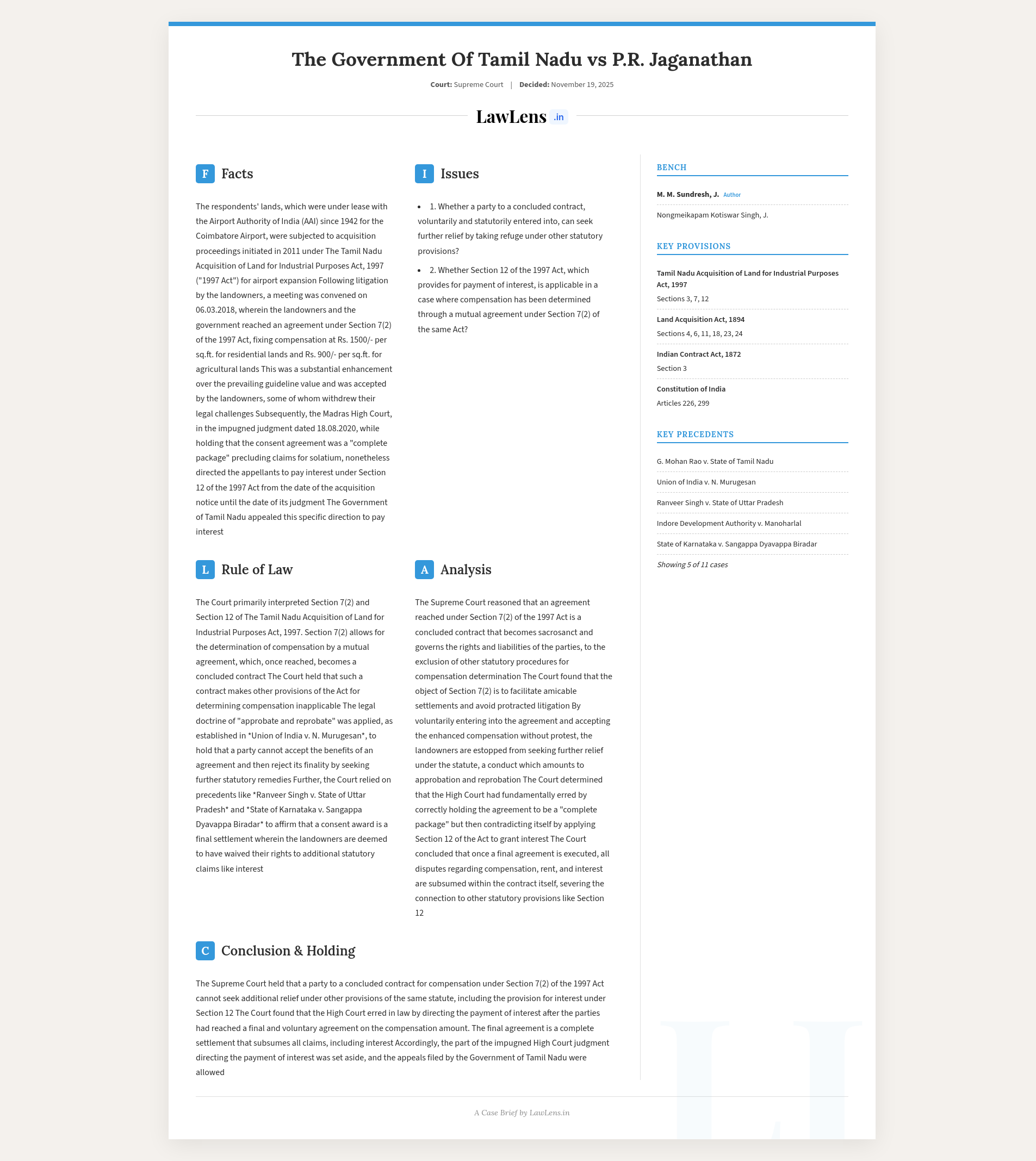 Govt. of Tamil Nadu v. P.R. Jaganathan; 2025 INSC 1332 - Acquisition - Settlement - Art. 226 Constitution
