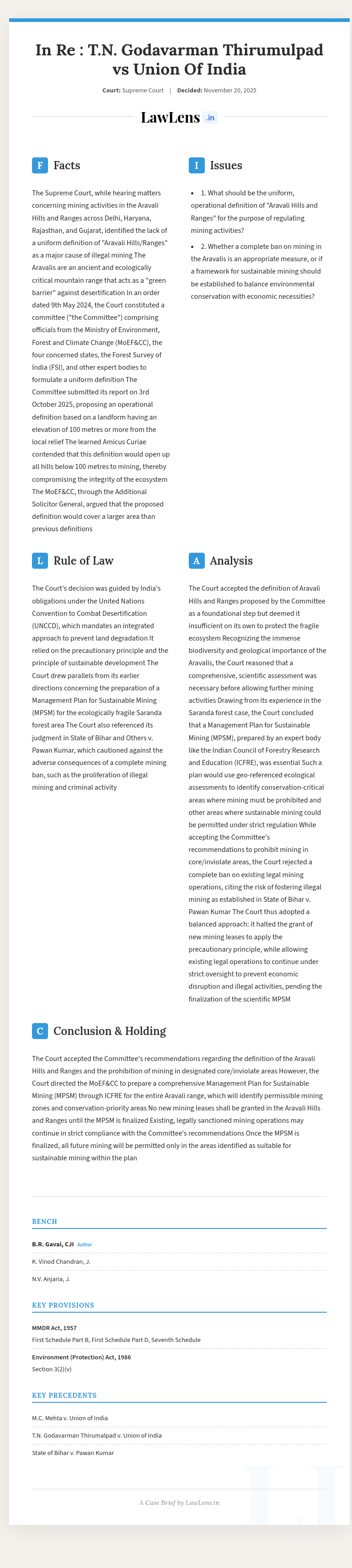 - Case name: In Re: Issue Relating to Definition of Aravali Hills and Ranges (I.A. No.105701 of 2024 in Writ Petition (C) No.202 of 1995; In Re: T.N. Godavarman Thirumulpad v. Union of India and Others)