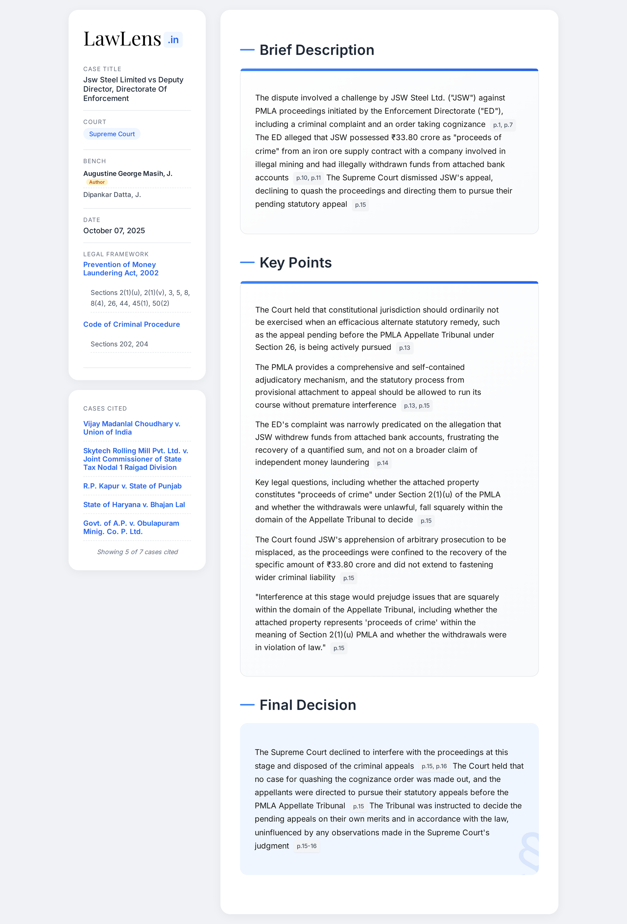 - Case name: JSW Steel Limited Etc. v. Deputy Director, Directorate of Enforcement Etc.