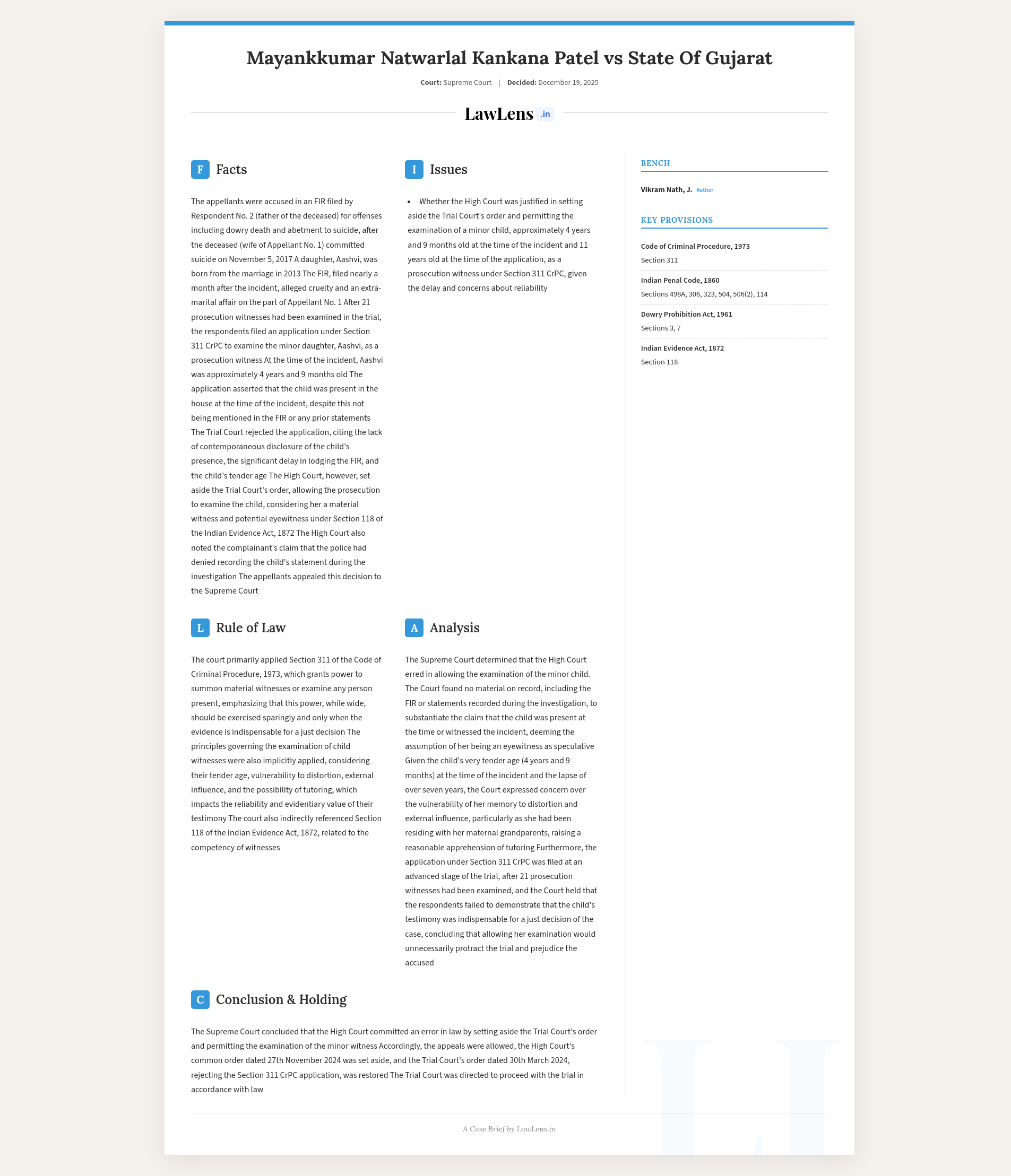 Mayankkumar Natwarlal Kankana Patel vs State of Gujarat 2025 INSC 1475 - S.311 CrPC - Minor Witness Recall