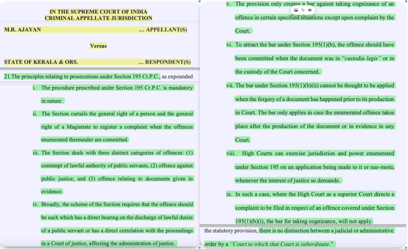 Code Of Criminal Procedure 1973 - Section 195- i. The procedure prescribed under Section 195 Cr.P.C. is mandatory in nature. ii. The Section curtails the general right of a person and the general right of a Magistrate to register a complaint when the offences enumerated thereunder are committed. iii. The Section deals with three distinct categories of offences: (1) contempt of lawful authority of public servants, (2) offence against public justice, and (3) offence relating to documents given in evidence. iv. Broadly, the scheme of the Section requires that the offence should be such which has a direct bearing on the discharge of lawful duties of a public servant or has a direct correlation with the proceedings in a Court of justice, affecting the administration of justice.v. The provision only creates a bar against taking cognizance of an offence in certain specified situations except upon complaint by the Court. vi. To attract the bar under Section 195(1)(b), the offence should have been committed when the document was in “custodia legis” or in the custody of the Court concerned. vii. The bar under Section 195(1)(b)(ii) cannot be thought to be applied when the forgery of a document has happened prior to its production in Court. The bar only applies in case the enumerated offence takes place after the production of the document or in evidence in any Court. viii. High Courts can exercise jurisdiction and power enumerated under Section 195 on an application being made to it or suo-motu, whenever the interest of justice so demands. ix. In such a case, where the High Court as a superior Court directs a complaint to be filed in respect of an offence covered under Section 195(1)(b)(i), the bar for taking cognizance, will not apply.