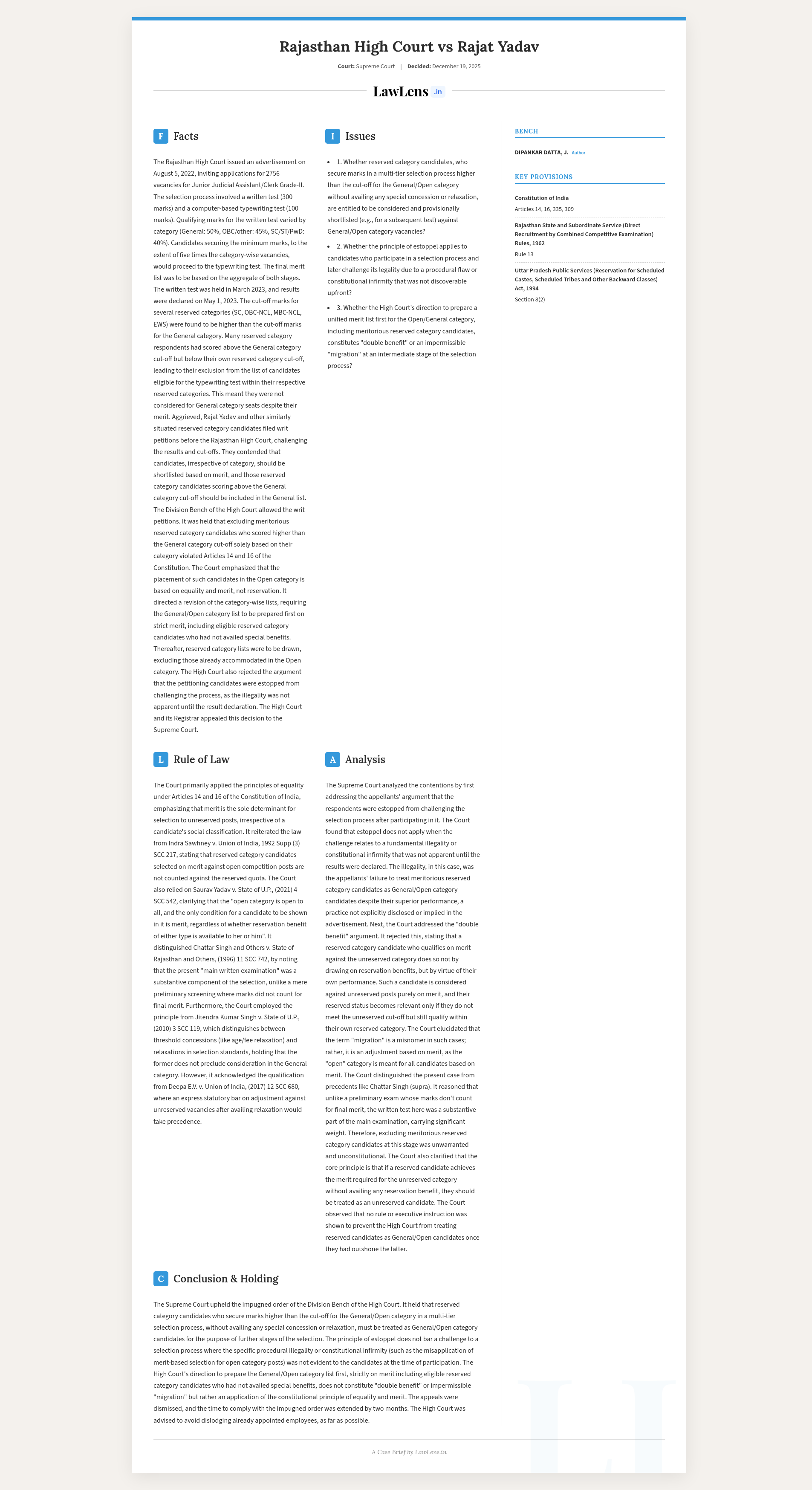 Rajasthan High Court vs Rajat Yadav 2025 INSC 1503 - Public Employment - Reservation - Open Category - Estoppel