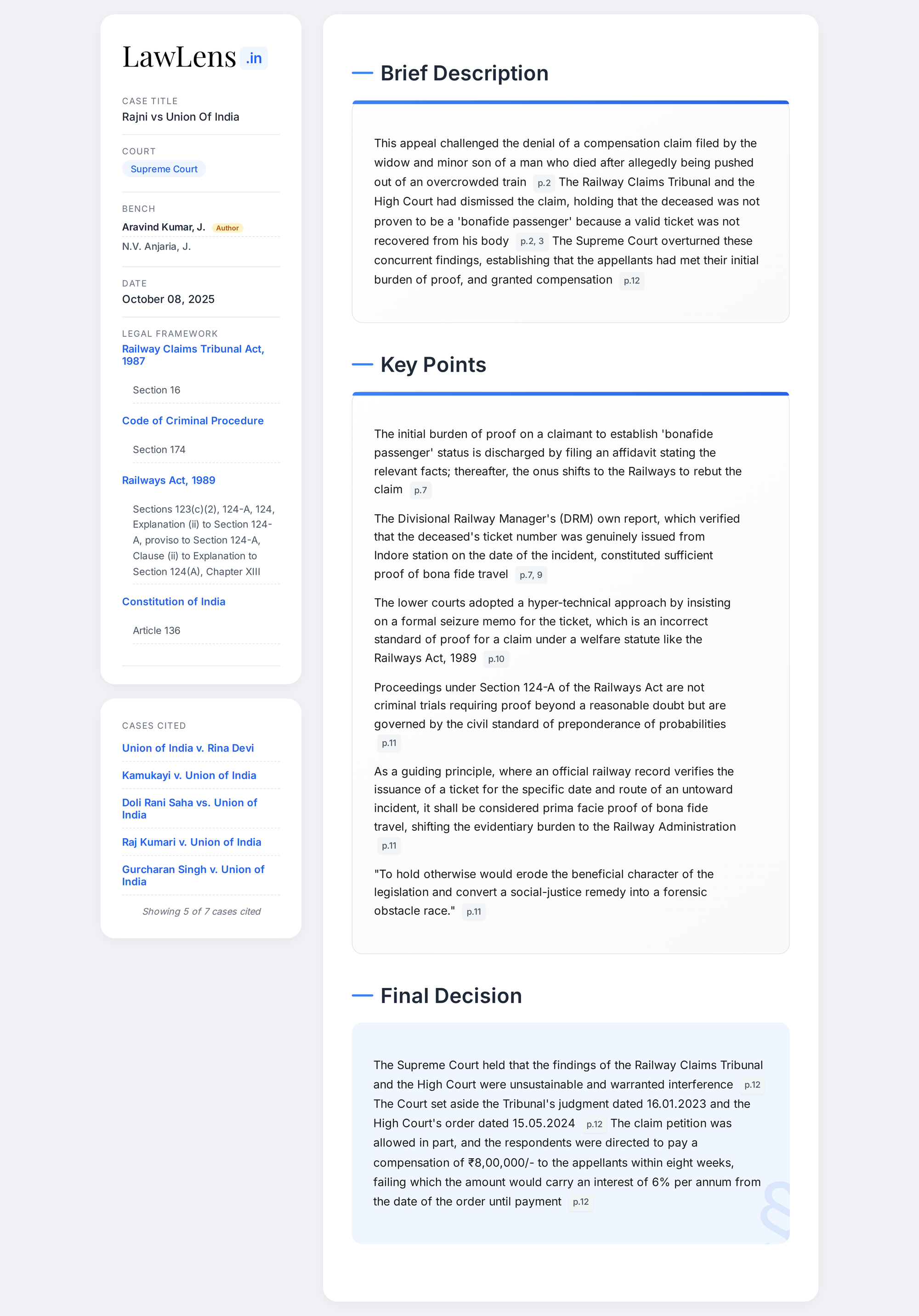 Rajni vs Union of India and Another 2025 INSC 1201- S.124A Railways Act - Bona Fide Travel