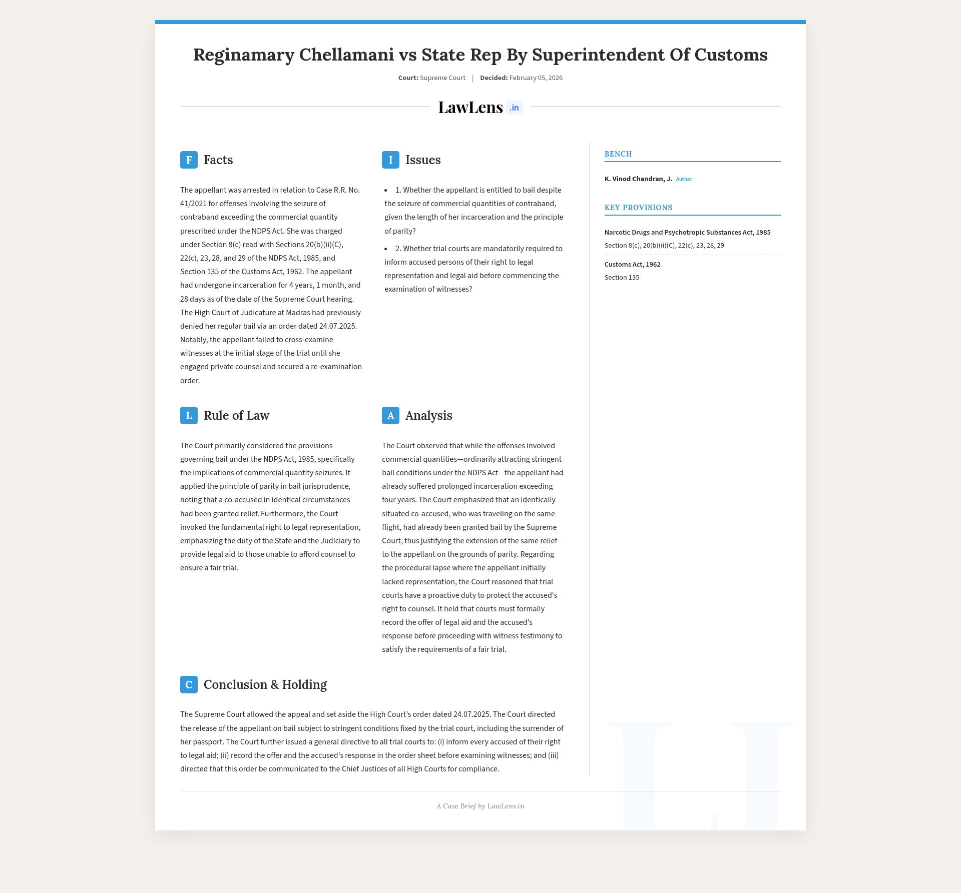 The appellant, Reginamary Chellamani, was accused of NDPS offences involving contraband above commercial quantity and had been in custody for about 4 years and 2 months when she challenged the Madras High Court’s refusal of regular bail. The Supreme Court, noting her prolonged incarceration and the fact that an identically situated co‑accused on the same flight had already been granted bail, allowed the appeal, set aside the High Court order, and directed her release on stringent conditions to be fixed by the trial court, including surrender of passport and cooperation in trial. The Court also issued an important procedural direction that trial courts must inform accused of their right to legal representation and legal aid, record the offer and response before examining witnesses, and High Courts must issue suitable instructions to trial courts to implement this practice scrupulously.