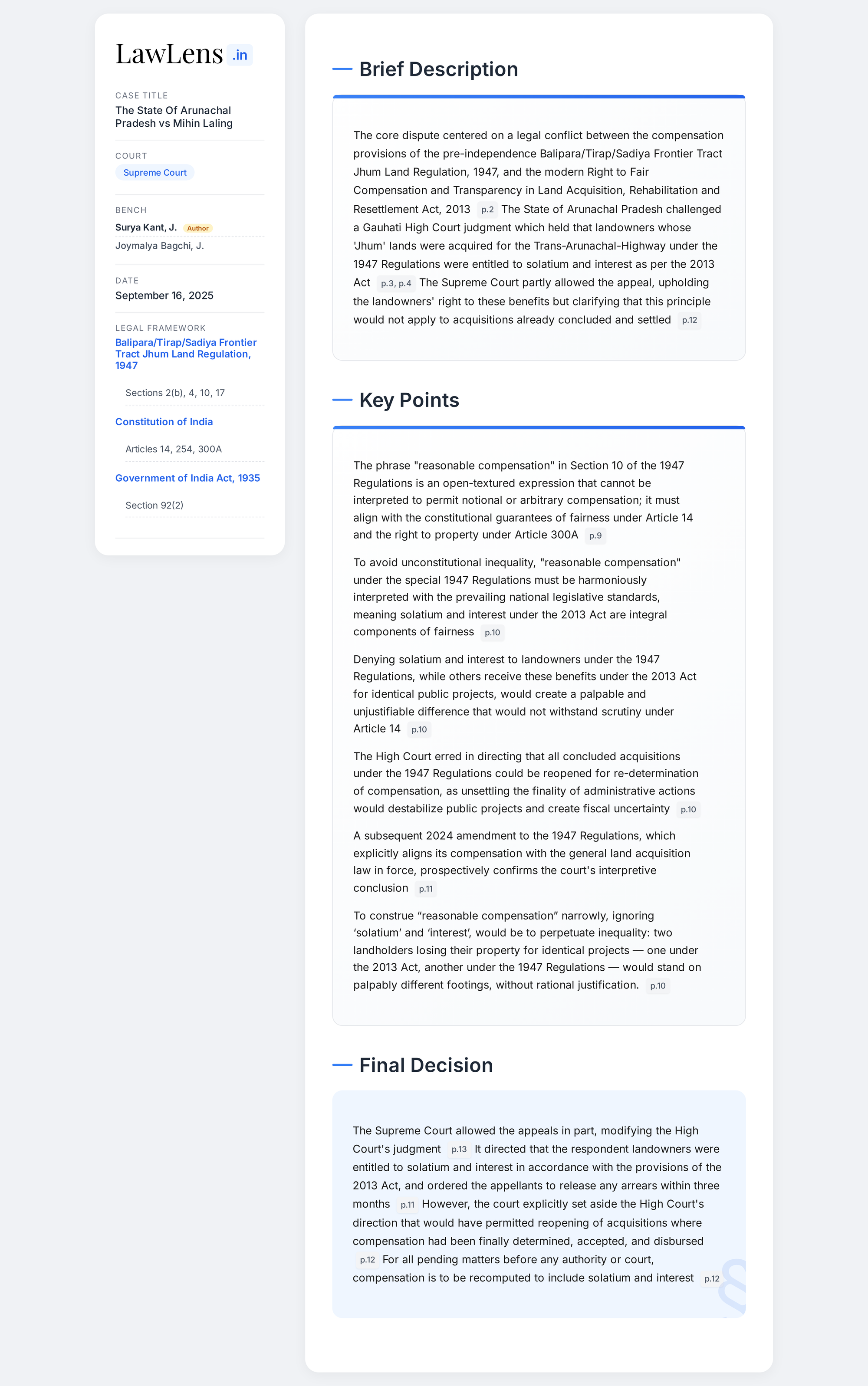 Balipara/Tirap/Sadiya Frontier Tract Jhum Land Regulation, 1947 - Section 10 - “reasonable compensation” in Section 10 must be harmonised with the prevailing legislative standards of the time, and that solatium and interest are not alien imports but integral components of fairness. This interpretive technique properly reflects the principle that subordinate or special legislation must be read in the light of constitutional values and later general enactments, particularly where the language is sufficiently elastic. (Para 22)