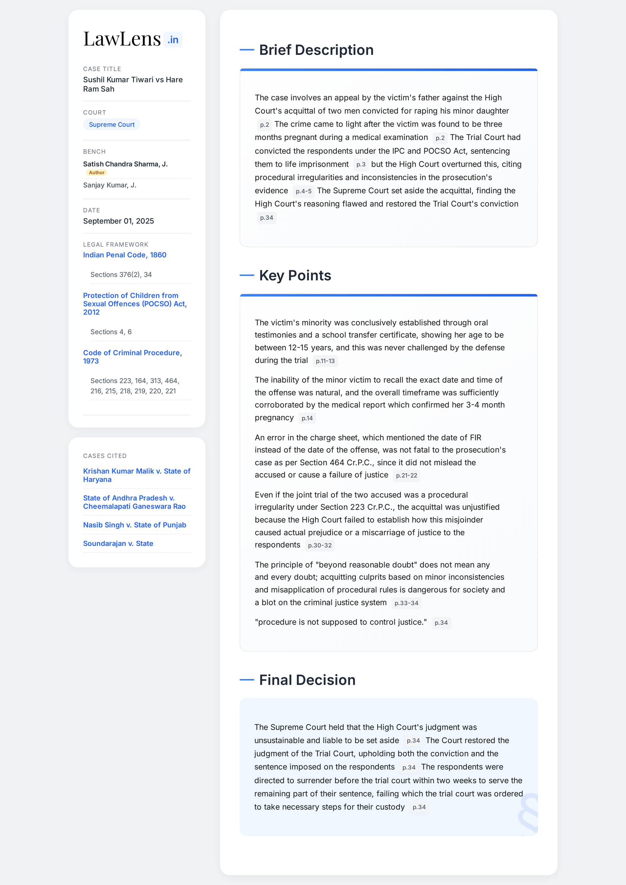 Sushil Kumar Tiwari vs Hare Ram Sah 2025 INSC 1061 - POCSO - Ss. 223,464 CrPC -Principle Of Beyond Reasonable Doubt