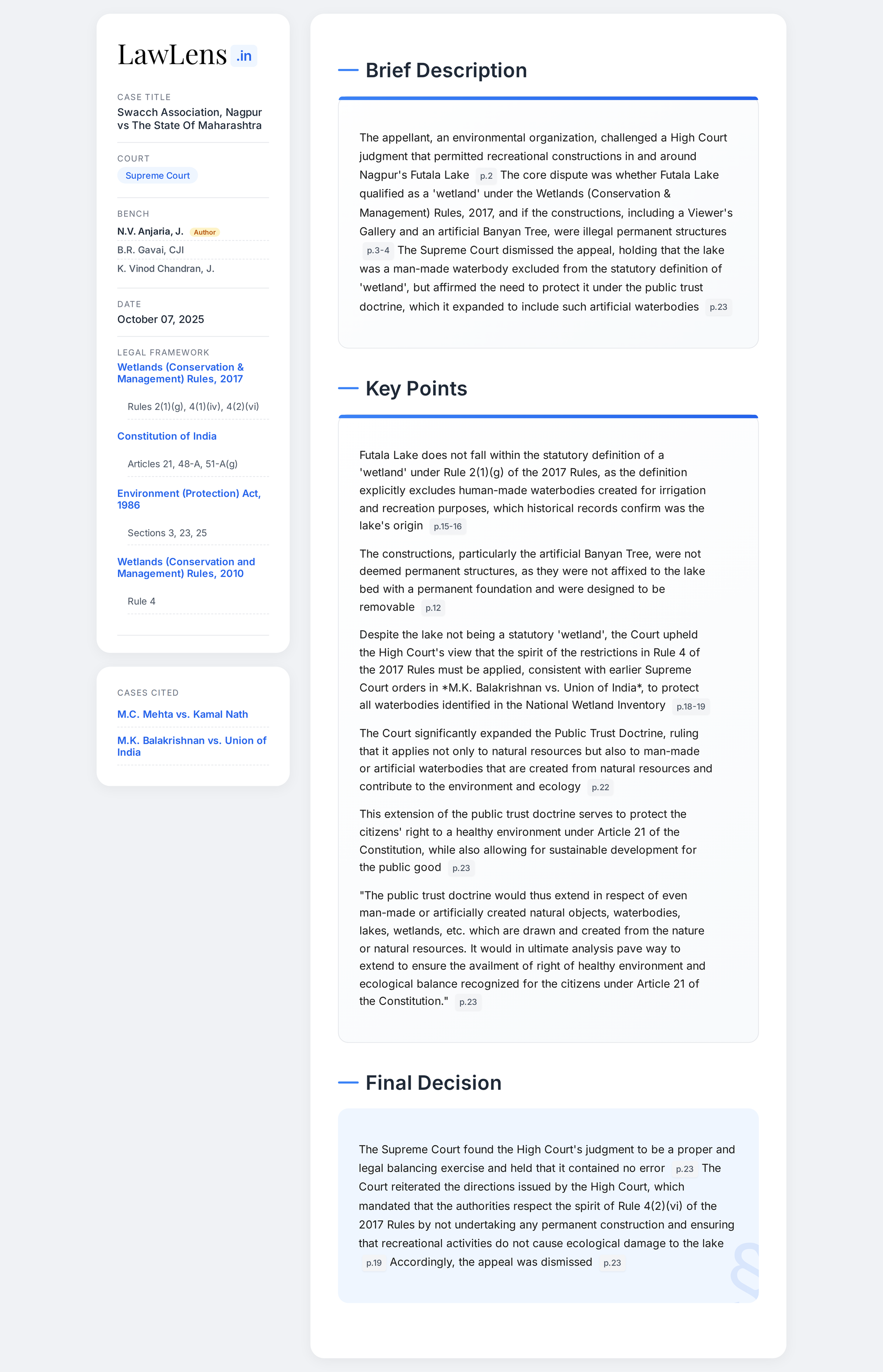 Swacch Association, Nagpur v. State of Maharashtra 2025 INSC 1199 - Public Trust Doctrine - Man Made Objects