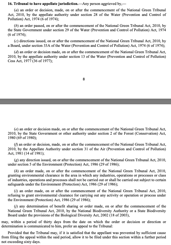 - National Green Tribunal Act, 2010: Section 16(h); proviso allowing condonation up to 60 days; Section 22 (civil appeal).