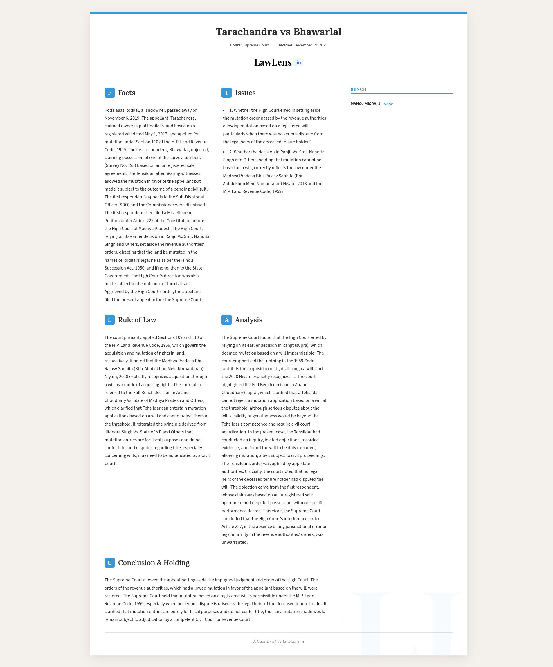 Tarachandra v. Bhawarlal 2025 INSC 1485 - Will - Mutation - MP Land Revenue Code