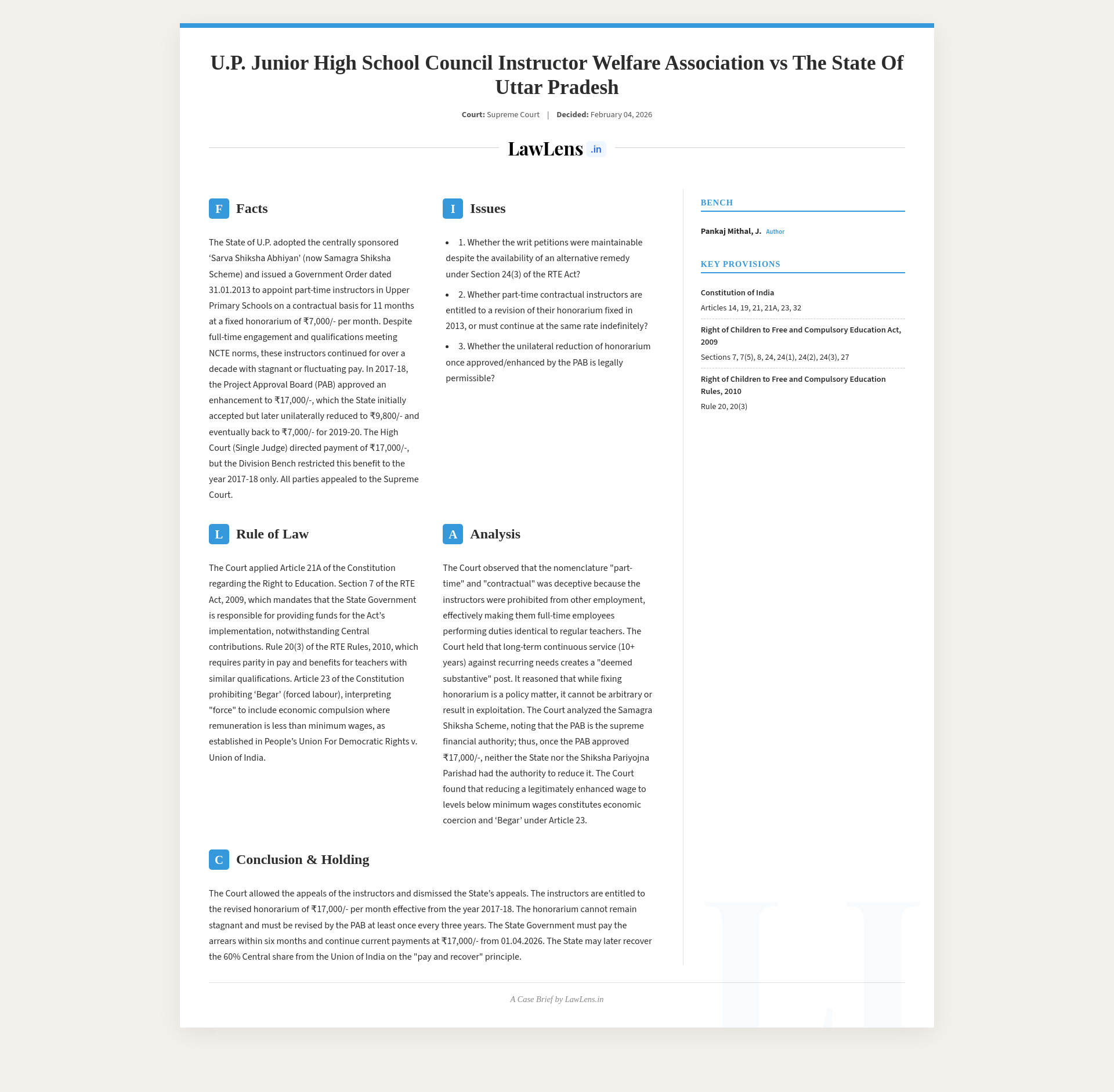 The Supreme Court held that so‑called “part‑time contractual” instructors in Upper Primary Schools of Uttar Pradesh, appointed under Sarva Shiksha Abhiyan/Samagra Shiksha, in fact function as full‑time teachers against deemed permanent posts and cannot be kept on a stagnant honorarium of ₹7,000 per month or have their remuneration reduced after enhancement. Recognising the Project Approval Board (PAB) as the sole financial authority under the scheme, the Court ruled that once PAB approved honorarium of ₹17,000 per month for 2017–2018, neither the State nor any other body could lawfully pay less, and that any such persistent low payment amounts to economic coercion and “begar” prohibited by Article 23. It therefore directed the State to pay all such instructors ₹17,000 per month with effect from 2017–18 (prospectively from 1 April 2026 with arrears for the intervening period), and held that honorarium must thereafter be periodically revised by PAB at least once in three years, with the State bearing primary liability on a “pay and recover” basis vis‑à‑vis the Union.