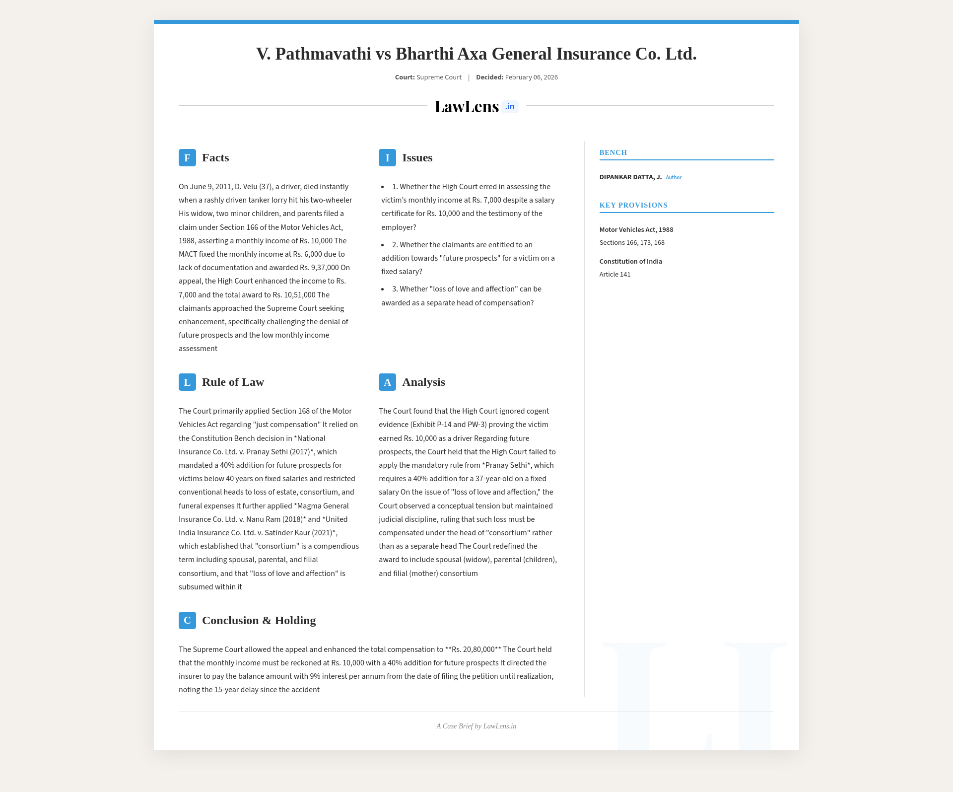 V. Pathmavathi v. Bharathi AXA General Insurance Co. Ltd. 2026 INSC 131 -Motor Accident Compensation- Loss Of Love & Affection - Consortium